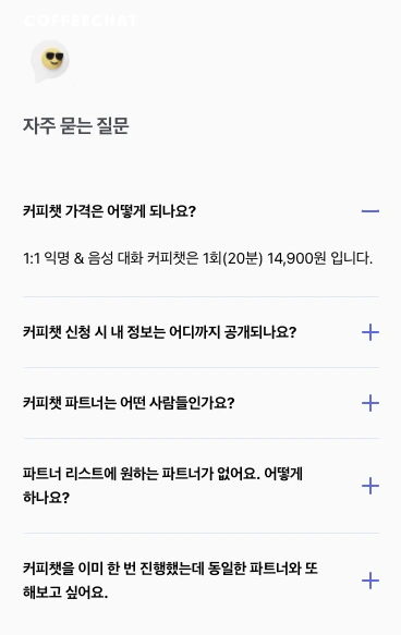말 그대로 사용자들이 자주 하는 질문을 모아두었다. 하나를 펼치고 다른 질문을 펼치면 열려있던 질문이 자동으로 닫혔다. 스크롤이 쓸데없이 길어지지 않아 답답함이 없었다 : >
