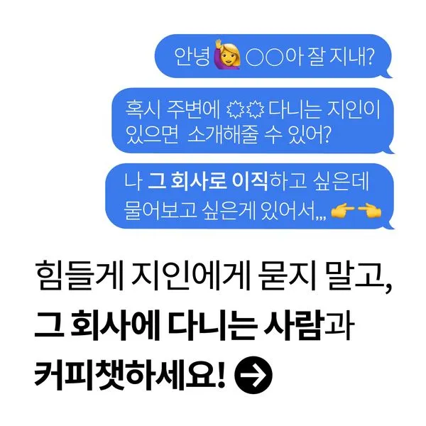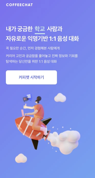 몇 달 전, 퇴사를 진지하게 고민하며 자소설닷컴, 원티드를 뒤지던 내 눈에 들어온 한 광고가 있었다. 광고 보고 "와 이거 쩐다" 말 그대로 와우! 하게 했던 서비스. 바로 커피챗이다. 숟가락보다 핸드폰을 자주 쥐고 사는 인생, 저엉말 다양한 앱과 서비스들을 써봤다. 하지만 그 과정에서 '정확하게 내 간지러운 부분을 해결해주는' 것들은 몇 개 없었다. 그리고 커피챗은 근래 나에게 가장 큰 놀라움을 선사한 서비스다!