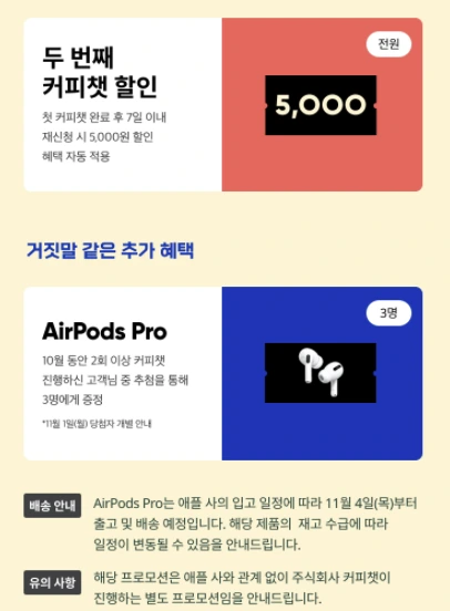 커피챗은 지금 신규 가입자 대상 프로모션을 진행하고 있다. 커피챗 무료 이용권 + 아메리카노 + 에어팟(추첨) 이벤트를 혜택으로 페이스북 광고를 돌리고 있다. 올해 2월 론칭 후, 아직 사용자 수/인지도가 낮은 상황이라 가입자 늘리는 것이 목표인 것으로 보인다. (21년 10월 30일 기준 인스타그램 팔로워 900여 명)