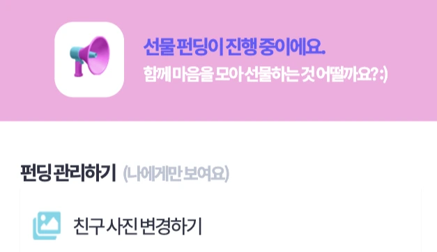 직접 전체 프로세스를 경험하며 펀딩 페이지를 개설해 본 결과, 펀딩 개설자에게만 보이는 화면인데도 펀딩에 금액을 지불할 수 있는 "선물하기" 버튼이 뜨거나 "친구 사진 바꾸기"(=선물 받을 사람 프로필 바꾸기, 즉 내 상황에서는 펀딩 페이지에 뜰 내 얼굴 사진 변경하기)라는 문구가 등장했다. 헷갈리지 않도록, 카피들이 펀딩 개설 상황에 따라 바뀌도록 수정되면 좋을 거 같다.