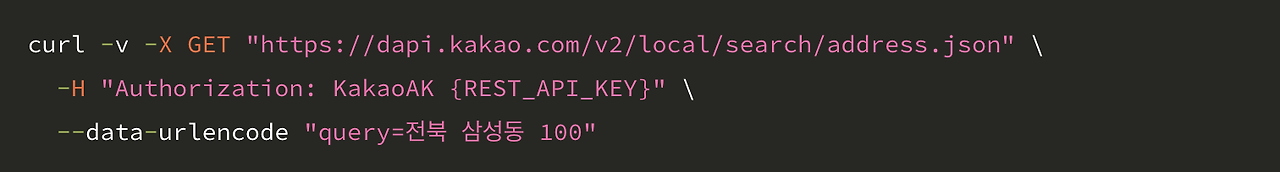 주소를 지도 위에 정확하게 표시하기 위해 해당 주소의 좌표 정보를 제공하는 API로 주소에 해당하는 지번 주소, 도로명 주소, 좌표, 우편번호, 빌딩명 등의 다양한 정보를 함께 제공합니다. 애플리케이션 REST API 키를 헤더에 담아 GET으로 요청합니다. 원하는 검색어와 함께 결과 형식 파라미터의 값을 선택적으로 추가할 수 있습니다. 이 API는 지번 주소, 도로명 주소 모두 지원합니다.