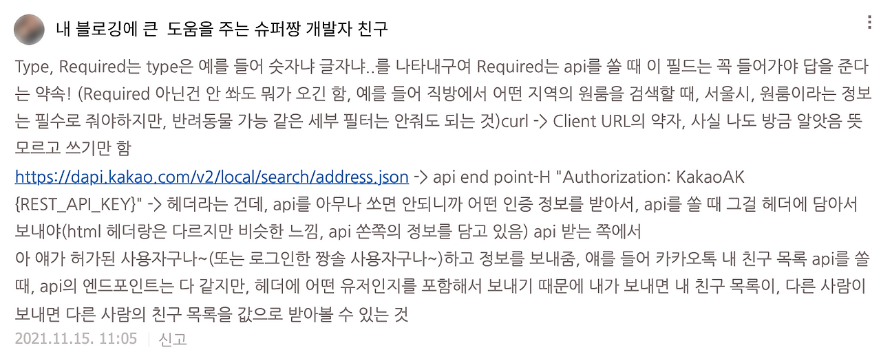 이번 블로깅에도 개발자 친구의 도움을 많이 받았다. 매번 댓글 달아주는 덕분에 API에 대해 더 잘 이해할 수 있었다! 고마워 친구!