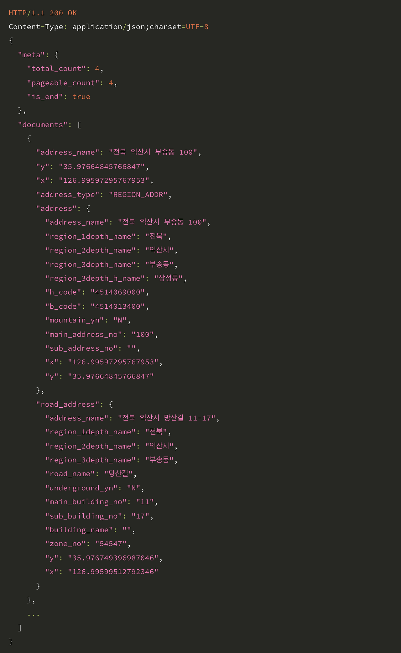 응답에는 다양한 데이터가 포함되는 것 같다. 아직 JSON에 대해서 배우지 못해 코드를 제대로 읽진 못하는 상태지만, GET 명령어 요청에 대해 meta/documents/adress/RoadAdress 등의 정보가 응답에 포함되어 오는 것 같다. 샘플을 한 번 살펴보자.