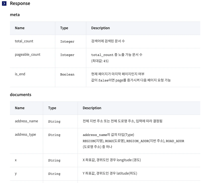 meta 데이터부터 보면, tatal_count(검색어에 검색된 문서 수) = 4개, pageable_count(total_count 중 노출 가능 문서 수) = 4, is_end(현재 페이지가 마지막 페이지인지 여부) = true 라고 응답값이 왔다. 한 페이지 안에 4개의 검색 결과가 노출되었다는 것을 알 수 있다! 그 아래에, document / Adress/ road_adress에 대한 정보가 순차적으로 나와있는 것도 볼 수 있다. 카카오 로컬 개발 가이드에 각 Parameter의 정의와 대조해보며 코드를 보면, "전북 삼성동 100"에 대한 정보를 코드로 쭉 알아볼 수 있다. (왜 뿌듯하지 ㅎㅎㅎㅎㅎ)