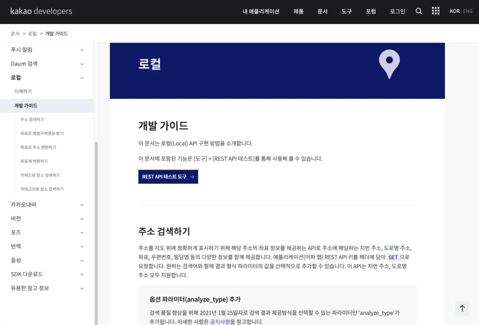 카카오 로컬 API의 개발 가이드로 들어가면 테스트 도구, 각 API 기능에 대한 코드 예제와 설명을 볼 수 있다. 카카오 로컬 API는 REST API로 JSON/XML 형식을 따르고 있다는 점을 확인할 수 있었다 : > 나는 그중 가장 기본기능인 주소 검색하기 기능을 좀 더 파헤쳐보기로 결정!
