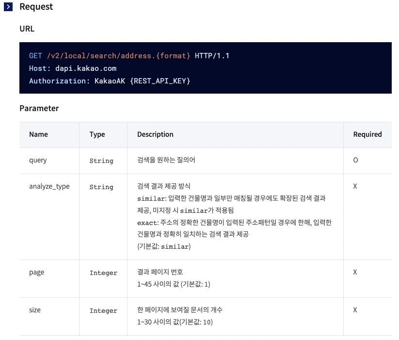 여기서 Parameter는 함수의 변숫값이라 할 수 있다. 내가 읽어 들이고(Read)싶은 내용이 있다면, GET 명령어로 궁금한 Parameter 값을 넣어 요청(Request)하면 된다. 이후 카카오 서버에서 요청한 데이터를 응답(Response)한다. 여기서 Type, Required의 의미를 잘 모르겠지만... 일단 넘어가자 ㅎㅎ