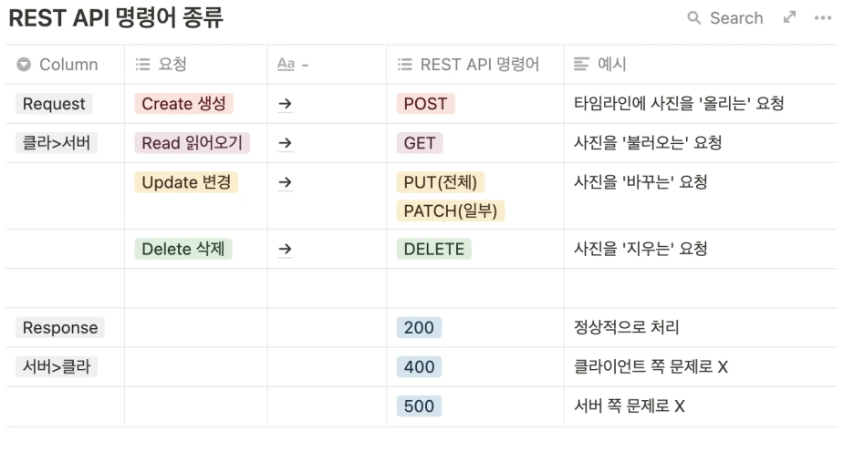 자원에 대한 행위를 나타내며, HTTP 프로토콜의 Method를 사용한다. REST API는 HTTP라는 규약에 따라 신호를 전송한다. 그리고 이 HTTP의 다양한 메소드(함수) 중 REST API에서는 표에 있는 것처럼 4-5가지를 사용한다. 표를 보면, 데이터를 다룰 때 기준이 되는 기본적인 요청인 C.R.U.D에 맞춰 명령어가 구성되어 있다. (*기획자는 데이터 흐름을 항상 CRUD 관점에서 볼 수 있어야 한다! 수정은 있는데 업로드가 없다던가 하면 안 되니까) 그리고 요청(Request)에 약속이 있듯, 응답(Response)에도 약속이 있다. 200, 400, 500 이런 식으로 문제 여부, 원인까지 확인할 수 있다.