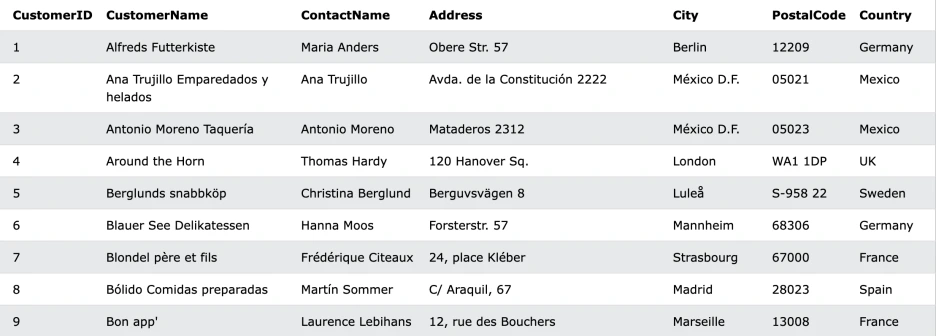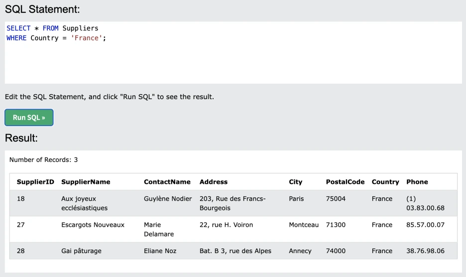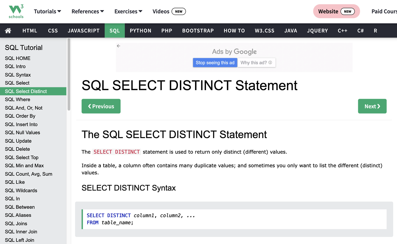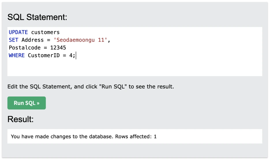 오늘 SQL 맛보기 진행에 도움을 줄 사이트는 W3스쿨즈(w3schools.com)다. 온라인으로 웹 기술을 배우는 교육용 웹 사이트다. SQL 외에도 HTML, CSS, JSON 등 개발 언어를 배울 수 있다. 좋았던 점은 따로 설치를 해야 하거나, DB가 없어도 SQL 문법 예제를 통해 배울 수 있다는 점이다! 차근차근 문법을 배워가도 좋지만, SQL은 (내 기준) 원하는 요청을 실행하는 명령이 직관적이라고 느껴졌기 때문에 예제로 바로 공부를 시작해보았다.
