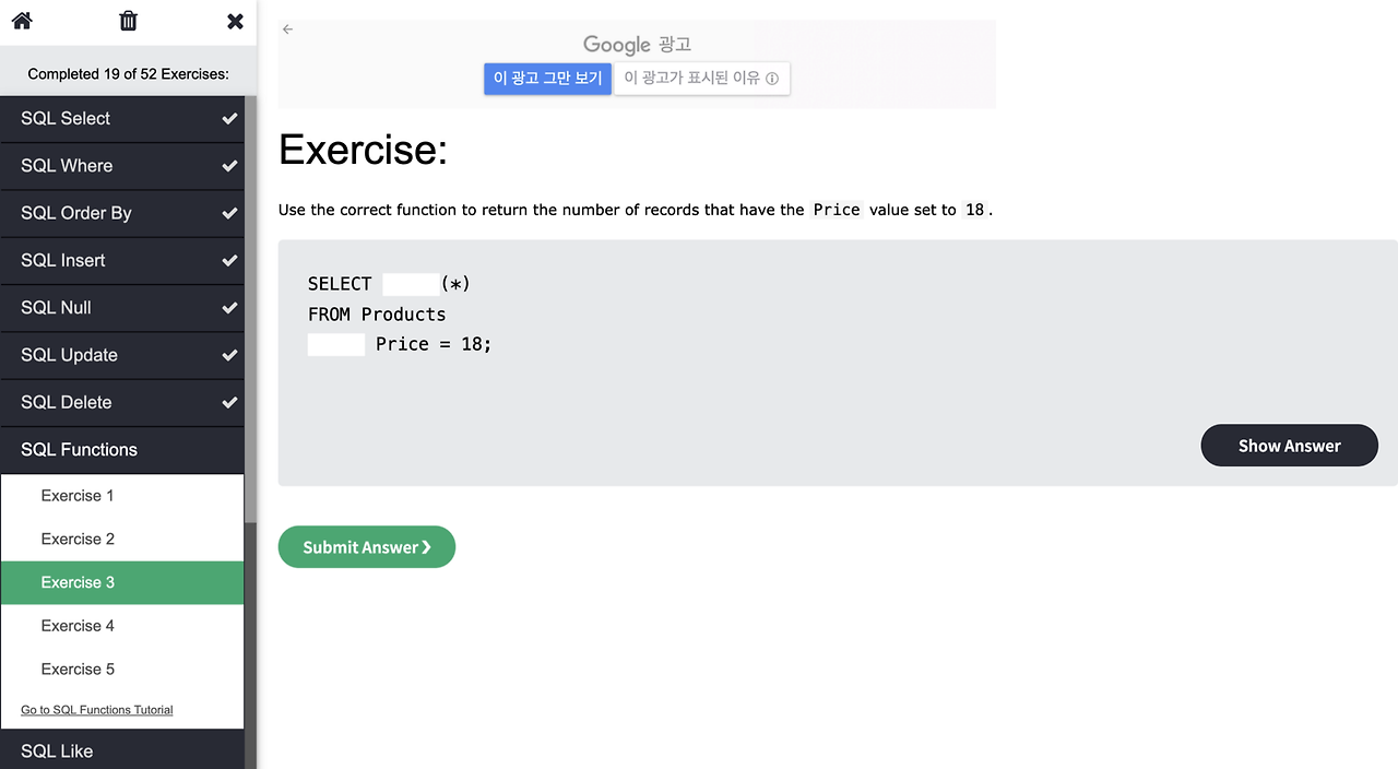 우측 이미지에서 보이는 것처럼 SQL의 여러 가지 문법 예제를 스무 개 정도 풀어봤다. 기본 문법에 대한 지식이 없었기 때문에 바로바로 맞출 수는 없었지만, 몇 가지 문법을 습득한 후에는 쉬운 문제는 바로 풀 수 있었다.