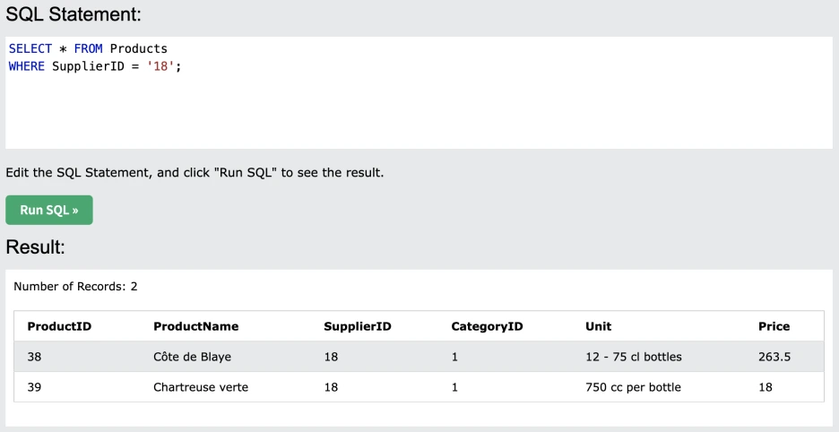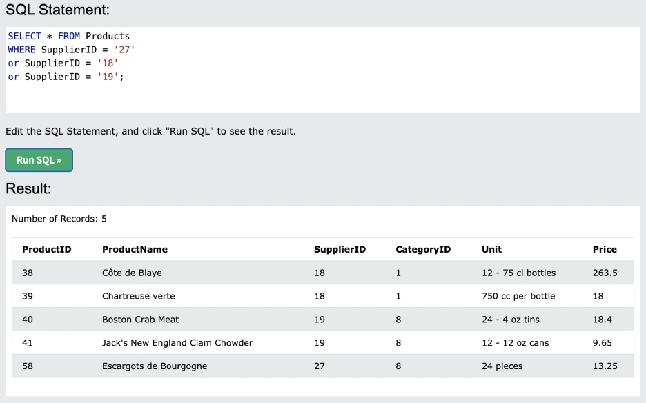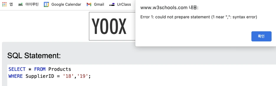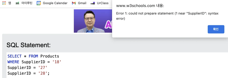 왜 실패일까... 공급자 ID =18 한 개로만 실행시켜 보면 작동하는데... 역시 예제로만 공부하는 건 한계가 있긴 하다. 왜 틀린 건지 모르겠고, 전체적인 기본 문법 원리에 대해 모른 체로 '명령어'만 직관적으로 이해하고 있는 형국...