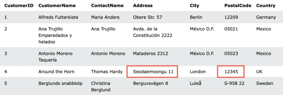 Customer ID = 4인 Thomas Hardy씨에게 문의가 들어왔다. 내일이 이삿날인데, 주소와 Postalcode를 바꾸고 싶단다. 이분은 회원정보 수정이란 걸 모르나? 이럴 때 Database를 어떻게 수정해야 할까?