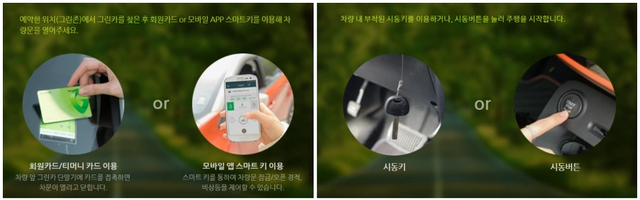 카셰어링 자동차를 찾은 후 회원카드를 차량 단말기에 접촉하거나 모바일 APP의 스마트키를 이용해 차량문을 열 수 있다. 차량 탑승 후에는 차량 내 부착된 시동키를 이용하거나, 시동버튼을 눌러 주행을 시작합니다.