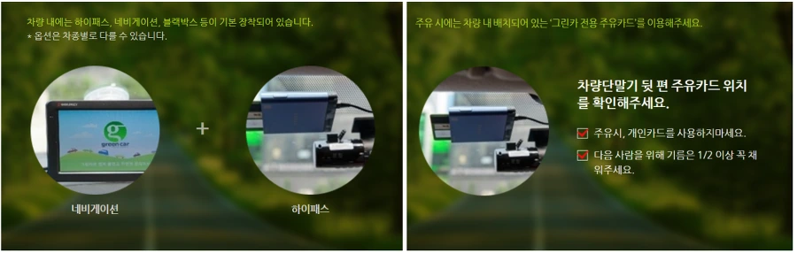 일반적으로 차량 내에는 하이패스, 네비게이션, 블랙박스 등이 기본 장착되어 있어 손쉽게 사용할 수 있다. 혹, 자동차의 주유가 안 되어 있을 시에는 차량 내 배치되어 있는 ‘카셰어링 전용 주유카드’를 이용하면 된다.