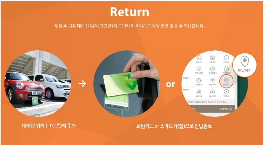카셰어링을 이용 후에는 처음 대여한 위치에 자동차를 주차하고 차량 문을 잠금 후 회원카드 접촉 또는 스마트폰의 '반납하기' 버튼을 누르면 반납완료 된다.