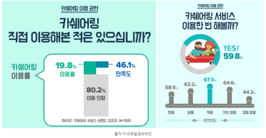 한 리서치 전문기관의 설문에 따르면 카셰어링을 이용해 본 사람들은 전체 20%도 안 되며, 운전면허 소지자의 약 60%는 카셰어링 서비스를 이용할 의사가 있다고 한다. 카셰어링을 이용할 의향은 남성(63.4%)과 20대(67.2%)에서 보다 두드러졌다.