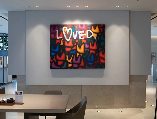 이제는 호텔에서 예술 전시를 종종 볼 수 있는데요, 안다즈 서울 강남 1층에 위치한 라운지 아츠(A’+Z)에서도 아트 큐레이션 플랫폼 오픈월과 협업해 전시를 진행하고 있습니다. 라운지 아츠와 조각보 레스토랑에서는 오는 2022년 1월 9일까지 작가 지히(Jihi)의 작품을 전시하고 있는데요, 연말연시 연말 시즌, 익숙한 기호들을 따뜻한 색감과 유쾌한 메시지로 풀어낸 작가 지히의 작품들은 행복감과 설레는 분위기를 전해준다고 해요. 라운지에서 디저트와 베이커리, 다양한 음료를 즐기며 작품을 감상하고, 작품 구매도 할 수 있습니다.