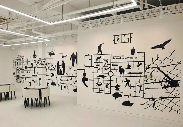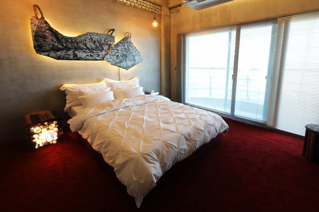 네! 리 메이커 호텔로 새 단장을 하기 전에는 '명파 DMZ 비치하우스'라는 숙박시설이었는데요. 거의 활용되지 않는 상태였다고 합니다. 이 건물은 2층짜리 건물 두 채와 8개의 객실 및 부대시설을 갖추고 있는데요. 각 객실이 8명의 작가의 손을 거쳐 완성된 아트룸이라는 것이 포인트입니다. 또한 아트룸 뿐만 아니라 레스토랑, 로비 등에도 다양한 예술작품이 전시되어 있어 호텔 곳곳에서 예술을 감상할 수 있습니다.