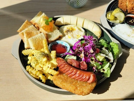 저는 브런치 메뉴로 아메리칸 브런치와 통치즈 돈까스를 주문했어요. 아메리칸 브런치에는 샐러드와 감자튀김, 해시브라운, 소시지, 바나나, 계란, 토스트 등이 함께 어우러져 나왔습니다. 통치즈 돈까스는 샐러드와 치즈돈까스, 피클, 라이스가 제공되었어요. 해산물이 가득할 것 같은 항구 뷰에서 아메리칸 브런치를 즐겨보니 색다른 즐거움도 있었던 것 같습니다.