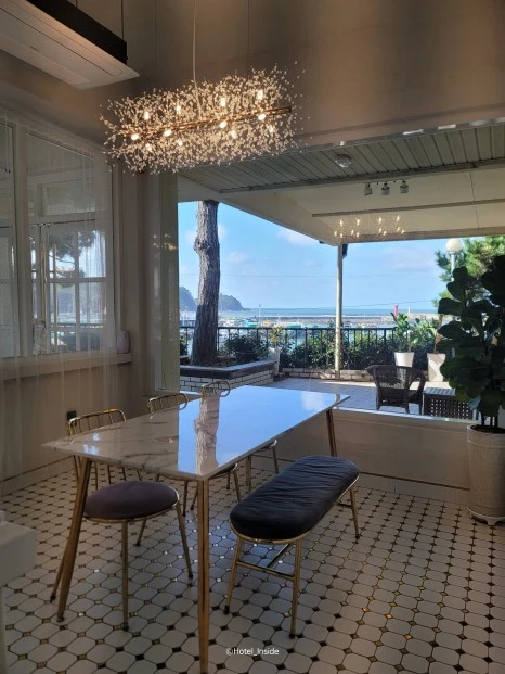 카페 내부는 화이트 톤의 인테리어로 꾸며져 있어요. 넓게 트인 창문으로는 푸른빛이 가득한 모항항의 항구 뷰를 전망할 수 있습니다. 화사함이 가득한 내부는 바다와도 조화롭게 어우러지는 것 같아요.