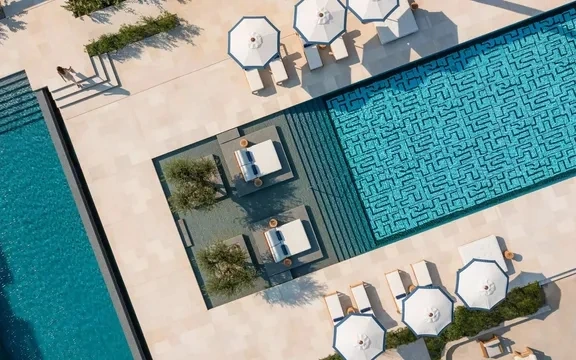 리조트는 약 125개의 객실을 운영 중입니다. 크게 방갈로 객실, 레지던스 객실, 빌라 등으로 나뉘어 있고, 대부분의 객실에는 프라이빗한 개인 수영장이 조성돼 있습니다. 객실은 1960년대의 우아한 그리스 문화에서 영감을 받아 디자인되었고, 친환경적인 디자인을 갖추고 있다고 하는데요. 흰색과 베이지 색등 자연스러운 색감에 패턴과 파란색을 접목해 우아하면서도 매력적인 분위기를 느낄 수 있다고 해요.