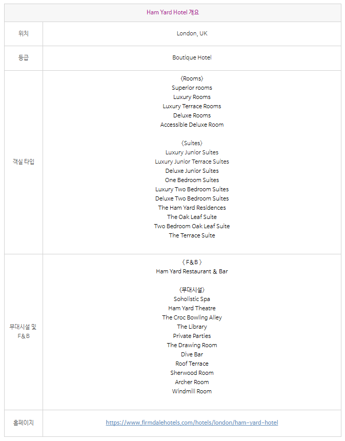 안녕하세요! 알아두면 쏠쏠한, 재미는 덤! 인 호텔 이야기를 들려드리는 에디터 주디입니다. 영국 런던에는 쇼핑-기념품-맛있는 레스토랑 등이 모여있는 대표적인 번화가 '소호 거리'가 있는데요. 오늘의 호텔 랜선투어에서는 소호 거리에 위치한 '햄 야드 호텔(Ham Yard Hotel)'로 여행을 떠나보려고 합니다. 그럼 지금부터 함께 만나볼까요?.