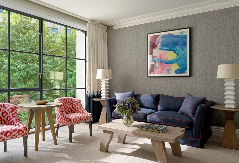 호텔은 유명한 호텔 그룹인 펌데일(Firmdale)의 최신 도시 호텔로 단조로운 외관과 대비되는 예술적인 내부 공간이 특징입니다. 호텔 공동 소유자이자 크리에이티브 디렉터인 Kit Kemp는 대담한 색상, 패턴, 질감을 사용해 활기찬 내부 분위기를 연출했어요. 호텔에는 유명 예술가들의 작품과 신흥 예술가들의 컬렉션이 함께하고 있다고 해요.