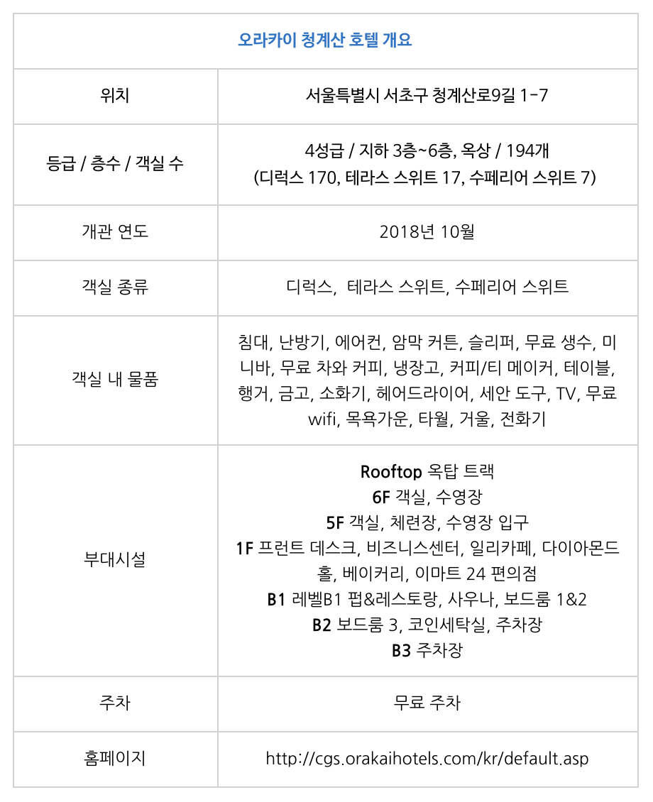 자세한 객실과 시설을 살펴보기 전에 먼저 오라카이 청계산 호텔에 대해 대략적인 설명을 드리겠습니다. 이곳은 4성급 호텔로, 청계산과 가까운 곳에 위치해 있고 인근이 대부분 조용한 주거공간이라 강남역과 가깝지만 여유로운 시간을 가질 수 있는 곳입니다. 더불어 신분당선 청계산입구역 1번 출구 바로 앞에 위치해 있어 강남 쪽에 직장이 있으신 분들께 추천드리고 싶습니다.