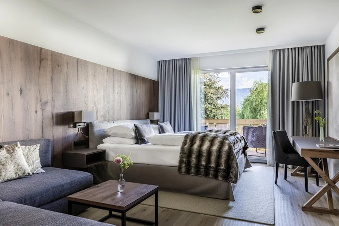 호텔은 106개의 객실 및 스위트룸을 운영 중이고 클래식, 우아함, 모던한 알파인 스타일의 공간을 선보입니다. 객실은 크게 더블룸, 패밀리룸 주니어 및 스위트룸, 홀리데이 아파트로 구분되어 있어요. 더블룸 객실 중에는 1인용 객실도 준비되어 있다고 합니다. 객실은 전통적인 알파인 스타일로 꾸며져 있고 우아한 알프스 가구가 배치되어 있습니다. 객실에서는 탁 트인 자연 전망을 만끽할 수 있어요.