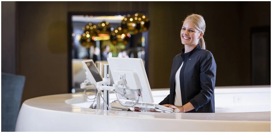 프런트 데스크는 호텔의 현관이자 가장 중심에 위치하며 고객이 호텔과 만나는 최초의 지점이자 퇴실 후 환송하는 장소이기도 한데요. 그야말로 호텔의 얼굴이 되는 이곳에서는 주로 예약 투숙객의 체크인, 체크아웃을 진행하거나 객실을 판매하고, 고객의 불만을 접수하고 해결하는 등 고객 서비스의 총괄적인 역할을 담당합니다. 또 고객의 요청에 따라 호텔 내 담당 부서를 연결하고 서비스를 조정해 고객과 호텔의 원활한 소통을 이어주는 역할을 합니다. 프런트 데스크는 단어는 리셉션에서 파생되었으며 이는 영국에서 처음 생성된 단어로 호텔마다 다른 용어를 쓰지만 같은 의미를 지닙니다.