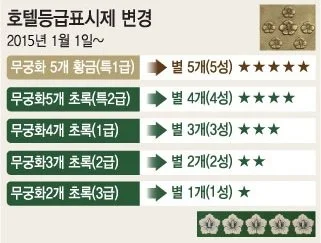 지금은 호텔 성급을 표시하는 별 모양 마크가 익숙하죠. 하지만 현재의 1-5성급 제도로 변경되기 전 과거 한국의 호텔 등급은 무궁화로 표시됐는데요. 당시에는 녹색 바탕의 무궁화 2개부터 5개까지로 나뉘고 최고 등급 호텔은 금색 바탕의 무궁화 5개로 표시해 속칭 '특급호텔'이라는 말이 여기에서 나왔다고 하네요. 원래 특1등급, 특2등급 등으로 나누어졌던 호텔 등급은 2015년 이후로 1,2,3,4,5성으로 변경되었다고 합니다. 현재 호텔 등급은 국제화 규격에 맞춰 별(star)로 표시되며 5성만 색상이 다르게 표시됩니다.