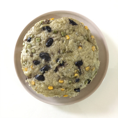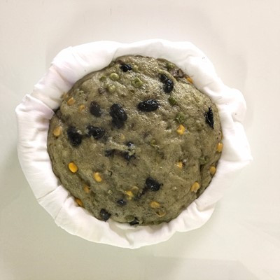 통밀 박력분 300, 통밀 중력분 75, 설탕 70, 베이킹파우더 3, 시나몬 2, 캐슈+두유 버터 75, 크림드코코넛 1/3팩, 아가베시럽 20. + 두유.