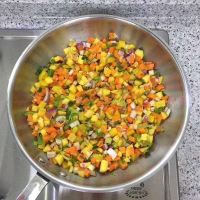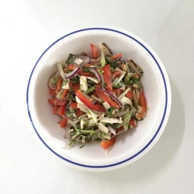 파프리카 1/2개, 오이 1/2개, 양파 1/3, 깻잎/고수/바질 몇 장, 구운 두부(생략 가능, 혹은 어묵 한 장), 견과류 다진 것, 레몬즙 20g, 피쉬소스(멸치/까나리 액젓)8g, 마늘3g(1개), 설탕 10g, 태국고추 1/2개