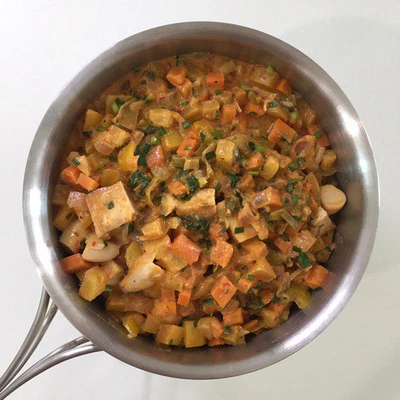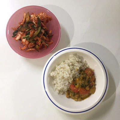 대파 잔뜩 볶다가 당근, 파프리카 넣고 볶아요. 맛없는 천도복숭아가 있어 소비 차원에서 한 알 넣었어요. 복숭아 볶다가 양파 투하. 냉장고에 있는 재료가 뻔해서 뭘 볶으면 대개 이런 모습이에요. 거기에 버섯 넣고, 병아리콩 삶은 것 or 구운 두부 자른 것을 넣고, 집에 있는 향신료를 마구 넣는 거예요. 참고로 저희 집에는 고춧가루, 카레가루, 파프리카가루, 코리엔더가루, 마늘가루, 양파가루가 있어요. 고춧가루, 간장 먼저 넣고 볶으면 불맛이 조금 날 거예요. 그러고 나서 집에 있는 향신료를 넣습니다. 코코넛밀크 넣고(조금 넣었어요, 아끼느라), 크림드코코넛 30g쯤 넣고, 농도는 물이나 두유로 조절해요. 불 끄고 집에 있는 초록색 풀을 넣어요. 저는 집에 무려 고수, 부추, 바질, 깻잎이 있어요. 차가워도 맛있고 뜨거워도 물론 맛있어요. 크림드 코코넛이 뭐냐고 물으시면 저 아래 링크 걸어 놓을게요. 그리고, 카레가루 이하 기타 등등의 향신료 넣지 않아도 맛있어요. 코코넛밀크가 들어가니 뭔들 맛이 없겠어요.
