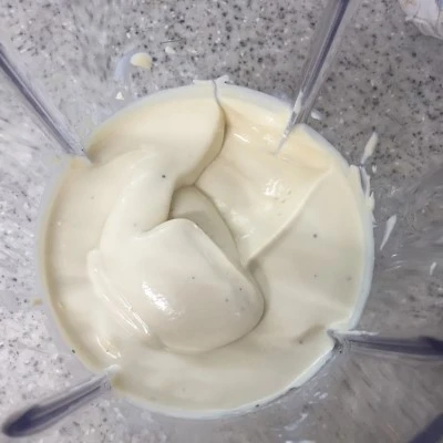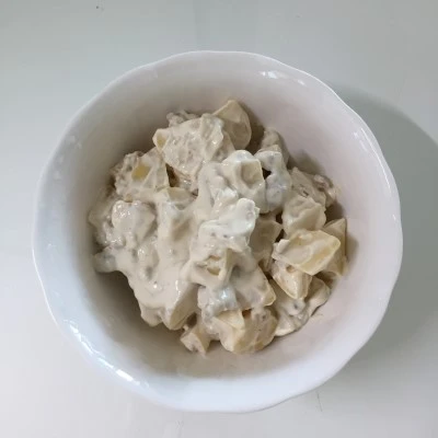 두부 300g, 레몬주스 15g, 애플사이더식초 5g, 디종 머스터드 5g, 설탕 10g, 소금 5g, 후추 조금.