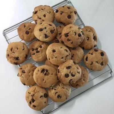 집 버터(만드는 법 전에 올렸어요)100g, 설탕 90g 넣고 크림화해요. 메이플시럽 20g, 두유90g, 바닐라익스트렉트 5g, 밀가루 250g, 베이킹파우더 4g, 베이킹소다 3g, 소금 1g, 초콜렛칩(혹은 건포도) 150g. 납작하게 만들어 180도 오븐 중간 단에서 10분 구워요. 엄청 맛있어요.