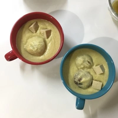 채식버터/오일에 밀가루를 볶다가 두유를 넣으면 채식 크림이 돼요. 한쪽에 치워두고. 마늘, 양파, 호박을 넣고 볶다가 다시마물을 넣고 푹 익혀요. 채소가 투명해지면 만들어 놓은 크림을 넣고 끓입니다. 소금, 후추로 간을 하고는 도깨비방망이로 웽 갈아요. 스프 완성. 먹다 남은 팔라펠을 퐁당 빠트려 따뜻하게 데워요. 큐브 모양 덩어리는 채식 치즈인데요, 치즈에 대해서는 할 말이 많으니 다음에 따로 하겠어요.