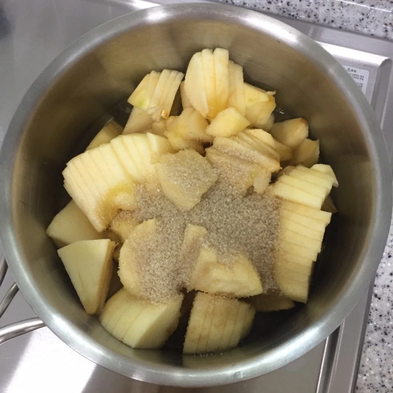2. 솥에 사과, 물, 설탕을 넣고 중불에 올려요. 끓으면,