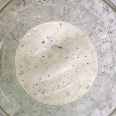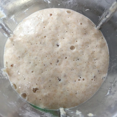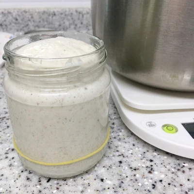 위와 같은 컨디션의 제 스타터를 가지고 스케쥴을 짜 볼 게요. 다음날 낮 2시에 스타터 100g을 오토리즈한 반죽에 넣을 거예요. 최소한의 밀가루를 사용하는 것이 목표예요.