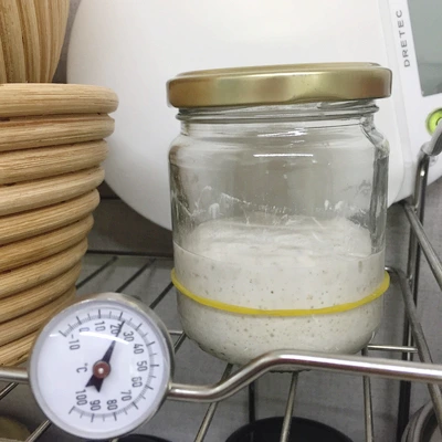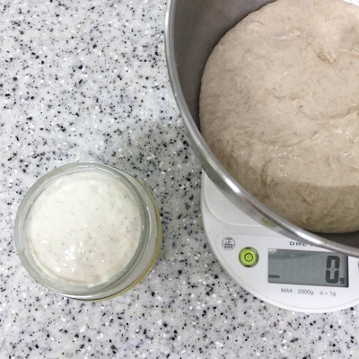 저온 발효로 굽는 사워도우 빵들은 대개 밀가루 대비 20%의 르뱅(스타터)를 넣잖아요? 예를 들어 레시피에서 요구하는 밀가루가 500g이라고 했을 때 필요한 르뱅(스타터)의 양은 100g인 거지요.