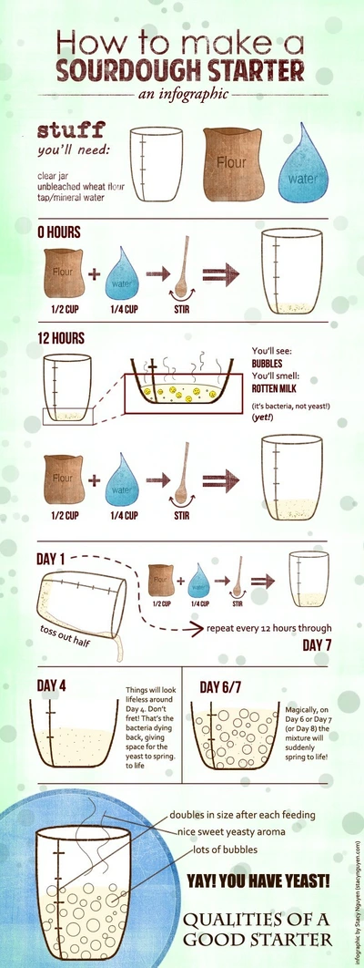 두 배 혹은 세 배로 신나게 몸을 키우던 밀가루+물 반죽이 3일째 혹은 4일째 되는 날 비리비리할 거예요. 이 놈이 죽었는지 살았는지 싶지요. 스타터는 이 날은 기준으로 드디어 효모, 이스트가 된대요. 이전까지 부피가 커졌던 이유는 순전히 박테리아 때문인데, 3,4일째에 이르면 박테리아가 죽고 그 자리에 효모가 생겨납니다. 그러니 하던대로 꾸준히 밥을 주세요. 이런 사실을 모를 때에는 이 고비를 넘기지 못하고 밀가루 많이 버렸어요. 도움이 될 만한 자료가 있어 가져왔습니다.