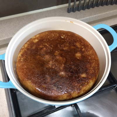 3. 약불로 예열한 후라이팬에 기름을 조금 두르고 반죽을 몽땅 쏟아붓고 뚜껑을 덮어요.