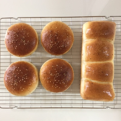 4. 이 반죽으로 밥빵 혹은 식빵을 만들 수도 있어요. 버거 번 네 개 만들고 나머지 네 개는 이렇게 한 덩어리로 만들어 아침밥으로 먹어요. 저처럼 미니오븐을 사용하지 않는다면 한 판에 여덟 개 몽땅 구울 수 있을 거예요.