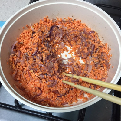 6. 양파와 마늘이 충분히 달큰하게 익었으면 렌틸콩을 넣고 3-4분쯤 볶아요.