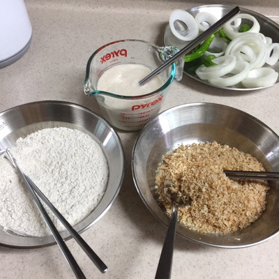 4. 밀가루-버터밀크-빵가루 각각 젓가락을 따로 써요. 이런 거 손으로 하다 보면 손가락이 엉망진창이 되잖아요. 그러면 어니언 링이고 뭐고 다 때려치우고 싶어져요.