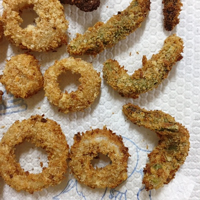 5. 그다음은 다 아시죠? 양파를 밀가루-버터밀크-빵가루 순서로 묻혀 오일 스프레이 후 에프 행.