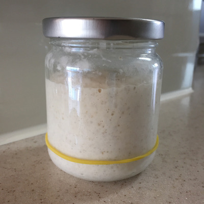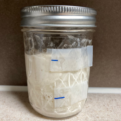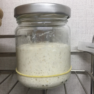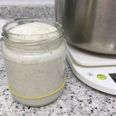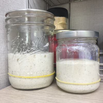 동시에 만든 스타터들, 앞은 수분율 60%, 뒤는 100%의 스윗스타터.