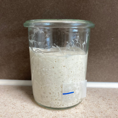 → 스타터는 수분율이 낮은 스타터가 높은 스타터보다 더 잘 자라요. 간단히 예를 들면 125%<100%<60% 이렇게요. 같은 수분율일 경우, 어떤 용기에 담느냐에 따라, 그 용기의 재질이 무엇이냐에 따라서도 다른 성장 모습을 보인다고 해요. 넓은 병에 스타터를 담았을 때보다 좁은 병에 담았을 때 부피가 더 커지는데, 그것은 병의 '벽'이 스타터를 받쳐 주기 때문이에요. 좁은 병에 담겨 네 배로 부푼 스타터가 넓은 병에 담겨 두 배로 부푼 스타터보다 빵을 만들 때 유리할까?라는 의문이 생겼고, 그 의문은 스타터를 가능한 크게, 다른 사람들이 자랑하듯 다섯 배 여섯 배가 되도록 키워야만 할까?라는 의문으로 이어졌어요. 그리고 그 의문은 다시 아래의 질문을 낳았지요.