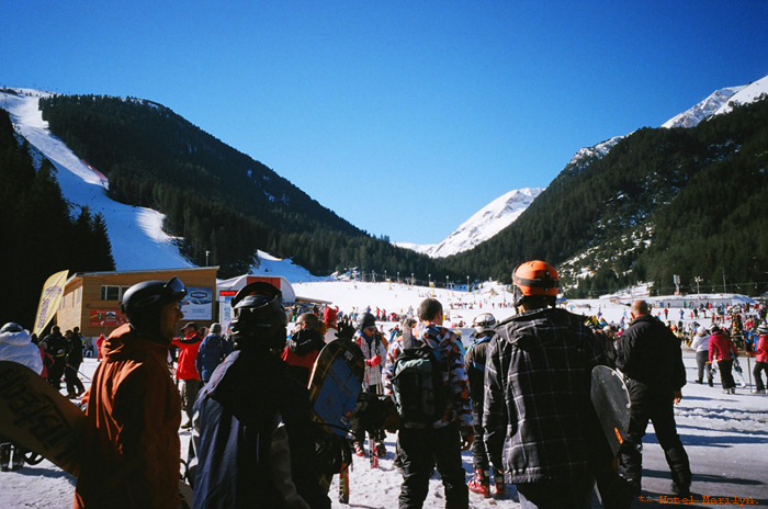 곤돌라 탑승장. 5일 짜리 패스를 샀다. 숙소에서 이곳까지는 멀쩡한 신발 신고 걸어서 10분. 스키부츠 신고 들고 이고 지고 걸어서 20분. 어느 날의 최고기온이 20도가 넘을 정도로 이상고온이 계속 되었기에 탑승장에 도착하기도 전에 땀으로 등이 젖고 말았다.