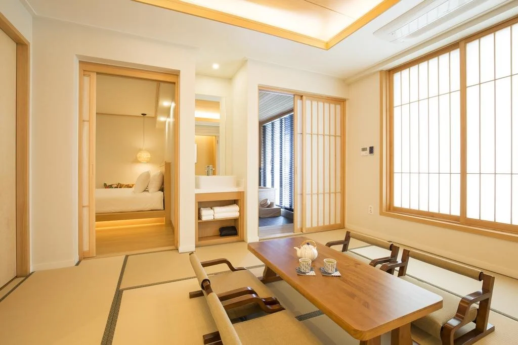 객실은 다다마더블과 다다미트윈이 있는데요. 객실마다 다다미가 깔려있는 온화한 거실, 퀸사이즈 침대가 있는 침실과 히노끼 욕조가 설치되어 있는 욕실로 구성되어 이국적이며 편안한 분위기를 자랑합니다.