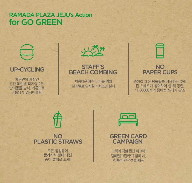 라마다 프라자 제주 호텔에서는 아름다운 제주도를 위해 다양한 캠페인을 진행하고 있는데요. 폐린넨을 리싸이클링하여 반려동물 방석, 커튼으로 아름답게 업사이클링을 하여 만들거나 또한, 투숙객이 그린카드 캠페인 참여시 친환경 깜짝선물을 제공합니다.
